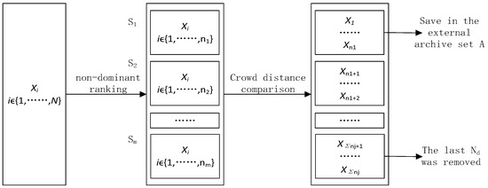 After the Pareto sorting is finished, the non-dominant solution set of the current population can be deposited into the external archive set. The last individual with the maximum non-dominance rank and minimum crowding distance will be removed.