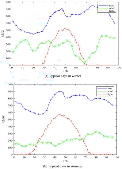 As can be seen in Figure 6, in one day in this region, the load is smallest in the early morning, and the output of wind power is large in the night and early morning. The peak of the photovoltaic power generation in both summer and winter is at noon, and the photovoltaic output peaks at night and in the early morning. The output of the two kinds of renewable energy has certain complementary characteristics in terms of time.