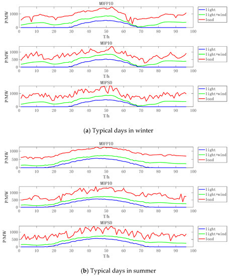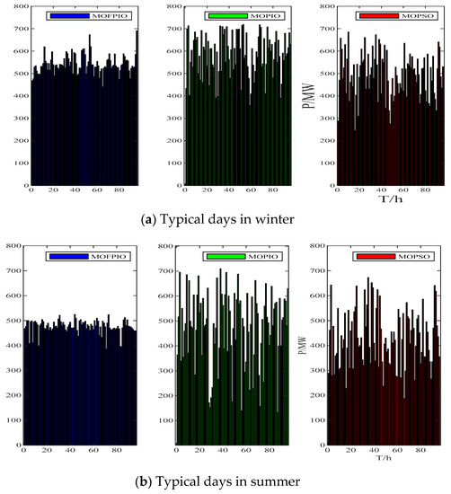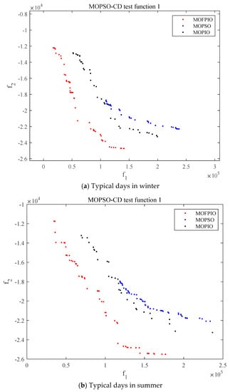 As can be seen in Table 1, the search range for the of MOFPIO is about 12,000–25,000 MW. The search range of MOPIO is about 13,000–23,000 MW. And the search range of MOPSO is about 18,000–22,000 MW. It shows that the search range of MOFPIO is similar to that of MOPIO, which is significantly larger than that of MOPSO. The MOPIO algorithm has a better global search capability. For the , the minimum values obtained by the MOFPIO algorithm are 34,676.793 MW and 17,148.577 MW, respectively, in summer and winter, and the maximum values are 141,018.920 MW and 176,687.155 MW, respectively. The results are less than the other two algorithms under the same conditions, showing the better optimization accuracy of the MOFPIO algorithm. So, MOFPIO has excellent optimization performance.
