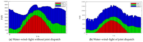 Figure 8 presents the results of the water–wind–light independent power generation and joint scheduling. As can be seen in the figure, after the complementary optimization scheduling of water–wind–light, the total power generation is 8.4722 million kWh. The hydraulic power generation is 4.5668 million kWh, accounting for 53.90% of the total power generation. The hydraulic power generation and photovoltaic power generation are 1.9242 million kWh and 1.9812 million kWh, accounting for 22.71% and 23.38% of the total power generation. It can be seen from the comparison of the separate output and the combined output that the output of the former hydropower fluctuates greatly with the time scale, while the output of the latter fluctuates less and greatly absorbs the solar energy.