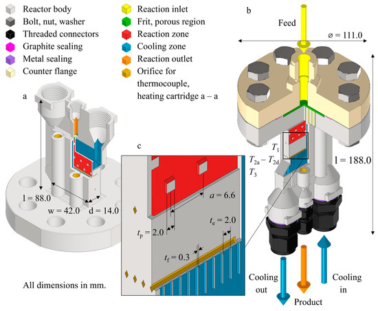 For spatially resolved temperature measurement, six horizontal thermocouple channels were placed inside the reactor, extending from the side to half the width of the device. Three channels are evenly distributed along the length of the reaction zone (l1 = 13.7; l2 = 27.5; l3 = 41.3 mm from the flange) in a wall between the reaction and cooling slits. On the length l2 there are three channels in further walls between the slits. The cross section of these channels is a rhombus at the tip. The readings of these thermocouples are referred to as T1, T2a to T2d, and T3. At the front and back of the reactor, there are two cylindrical channels each for heating cartridges and one for a thermocouple. At the top end of the reaction slits, a porous region is made together with the dense walls of the reactor. The porous region holds the catalyst in place but allows fluids from the reaction zone to pass through to the top port (G1/8” internal thread). The inlet and outlet of the cooling zone are both routed upward to ports (G1/2” internal thread) that terminate at the same level as the reaction port.