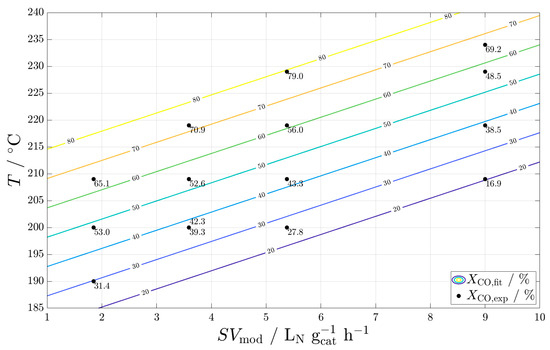 We fitted the CO conversion to a model equation in the form of Equation (10). The inputs were normalized to the axis limits shown in Figure 3 and the output was normalized to [10; 90]. The quality of the fit can be found in the Supplementary Information.