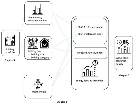 Outline of the experimental setting in this study. In Section 3, we illustrate the data set of 113 public buildings in Berlin; Section 4 details the methodology for the reference models as well as the proposed AutoML approach; Section 5 presents an evaluation and comparison of the predictive performance of the two reference models and the proposed AutoML model. Note that all methods obtain the same amount of data, but the reference models aggregate the data in a different manner than the AutoML approach.