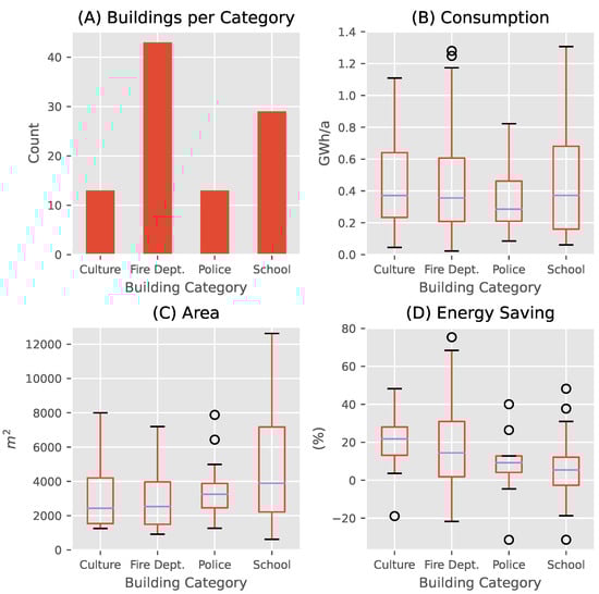 The data set comprised 113 public buildings in total and covered a wide range of building functions and properties. All data were provided by the Berliner Immobilienmanagement GmbH (BIM) (https://www.bim-berlin.de/ (accessed on 13 August 2023)), a company owned by the state of Berlin managing public buildings in the city of Berlin. In the data shared along with the manuscript, records were anonymized by removing addresses of buildings. Our data set has annual consumption values for 47 fire stations, 12 cultural institutions (e.g., theaters), 33 schools of higher education and 21 police stations. The building yearly consumption for heating (including hot water) for all categories and the building areas as well as the distribution of buildings in the data set are listed in Figure 2. Heating systems in these buildings were either based on gas or district heating. The energy consumption was monitored in the intial state of the building and after the implementation of a weather-predictive heating control algorithm as an ECO measure.