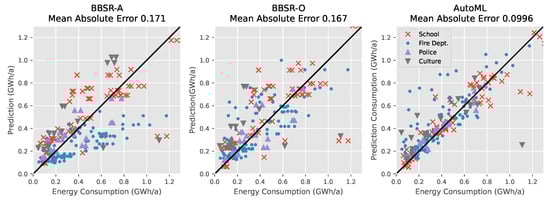 Comparison of measured yearly energy consumption (x-axis) and the consumption predicted (y-axis) with the respective model described in Section 4.2 (left), Section 4.3 (middle) and Section 4.4 (right). Symbols below the line indicate that the respective model underestimated the consumption, symbols above the line indicate that the model overestimated the energy consumption. AutoML-based predictions (right) achieve lower errors compared to the linear methods (left) and (middle).