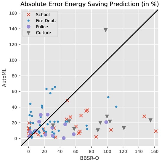 Comparison of absolute errors (in % of energy saving predictions for the BBSR-O model (x-axis) and for the AutoML model (y-axis)). For most buildings, the linear BBSR-O model overestimates the savings.