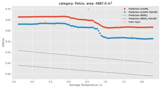 With the methods developed in this study, we can make predictions for energy demand of individual buildings after retrofitting buildings with energy efficiency measures. In Figure 5, we show such a prediction for a building in the category Police Station as a function of the mean heating period outside temperature, defined here as days with temperatures lower than 18 °C. We show the linear predictions with the BBSR-O model as well as the more flexible predictions with the AutoML approach for weather features simulated with the method detailed in Section 4.5.2. Both models are able to predict the savings obtained with the retrofitting measure, however, the AutoML approach extrapolates differently compared to the linear BBSR-O approach: the AutoML approach is more conservative than the linear modeling approach for temperatures outside of the range of the training data. This could explain the better empirical performance of the AutoML approach compared to the classical linear method.