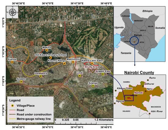 The study was carried out at Laini Saba village, Kibera informal/slum settlement, Kibra constituency, in Nairobi County. The Kibera informal settlement is one of the largest slums in Africa with a population of 120,057 [39]. The settlement sits on a flat ridge plateau located about 5 km southeast of the Nairobi city centre (Figure 1) and covers an area of about 550 acres [40].
