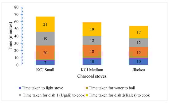 In Kenya, cooking ugali involves boiling water, adding maize flour, and mashing the solid mix until it is well cooked. After ugali is ready, it is removed from the pot and covered to keep it warm. On the same stove, vegetables are then cooked and the two are served together. To cook, stoves first need to be lit. As such, the time consumed in the cooking process included the time for lighting the stoves, the time taken to bring water to boil, and the time taken to cook the two dishes. It took an average of 7 min to light a small-sized KCJ while the Jikokoa and medium-sized KCJ stoves each took 10 min. The Jikokoa stove saved time spent while cooking by 26.7% and 10.2% compared to a small-sized KCJ and a medium-sized KCJ, respectively. During the whole cooking process, which spans from lighting the stove to the completion of cooking the two dishes, Jikokoa, medium-sized KCJ, and small-sized KCJ stoves took 54, 59, and 67 min, respectively. The Jikokoa stove saved 19.4% and 8.5% of the time taken compared to small-sized and medium-sized KCJs, respectively (Figure 4). There was a significant difference (p = 0.0341) in time spent while cooking on the Jikokoa stove compared to the small-sized KCJ.