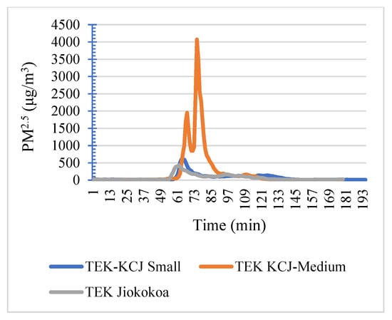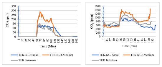 The concentration of indoor air pollutants varied during the cooking period with all stoves as illustrated in (Figure 5a–c). Concentrations of CO in the current study were above the WHO-recommended levels of 35 mg/m3, equivalent to 40 ppm at 760 mmHg and 25 °C per 1 h of exposure where exposure to this level should not occur more than once per day with light physical activities [49]. The concentrations were well above the recommended levels by 162%, 190%, and 425% for Jikokoa, small-sized KCJ and medium-sized KCJ stoves, respectively, considering charcoal from the same kiln and species. Recommended concentration levels of particulate matter (PM2.5) by WHO over a 24 h period of exposure is 25 μg/m3 [50]. During the cooking exercise, the concentration levels of PM2.5 were above the WHO-recommended levels of 25 μg/m3 by 585%, 629%, and 2831.2% for Jikokoa, small-sized KCJ and medium-sized KCJ stoves, respectively, while using P. juliflora charcoal produced using a TEK. Indoor air concentrations of CO and PM2.5 in this study were relatively high even when compared to those from firewood [13]. This can be attributed to the poor ventilation and air circulation in Kibera urban slum dwellings. Muindi et al. [51] reported less than 20% of households in Korogocho and Viwandani slum settlements in Nairobi opening doors for ventilation while cooking in the evening and less than 10% were reported opening their windows. In this study, the researcher noted that it was normal practice for cooks to keep their windows closed during the cooking process, thus limiting air circulation and causing accumulation of pollutants in the kitchen/cooking area as cooking continued. Due to limited space in rooms (Figure 2), windows were permanently closed, and the space was utilized for other purposes, such as hanging kitchen utensils or a television set. This poses a great danger to the people in the house during cooking since the same room is used for sitting and sleeping (Figure 2). Average CO2 concentrations were below the WHO’s permissible exposure limit of 5000 ppm averaged over an 8 h workday [50].