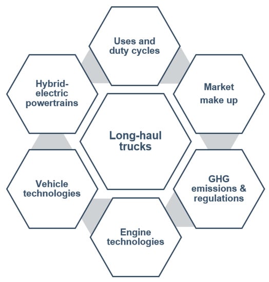 This paper is organized as follows: First, the LHTs’ make-up and market will be shown. Second, the current regulations on GHGs will be presented. Third, recent technological developments in the engine, vehicle, and powertrain will be reviewed. Subsequently, the electrified powertrains will be scrutinized, considering the long-haul trucking application. Finally, the standard and experimental drive cycles and their importance in designing hybrid powertrains will be discussed, highlighting existing research gaps. Finally, the topics that will be discussed in this paper are summarized in Figure 1.