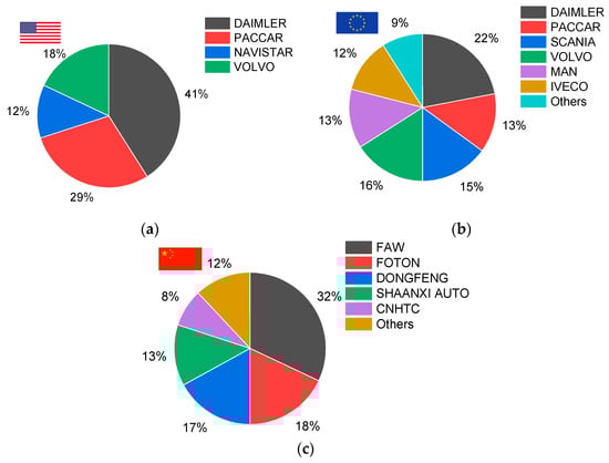LHT OEM market share in (a) the U.S. (2021), (b) Western Europe (2017), and (c) China (2016) [,,,].