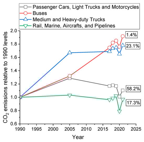 CO2 emissions in the transportation sector in the U.S. relative to 1990; the values in the box show the 2021 CO2 share in transportation—data obtained from [,].