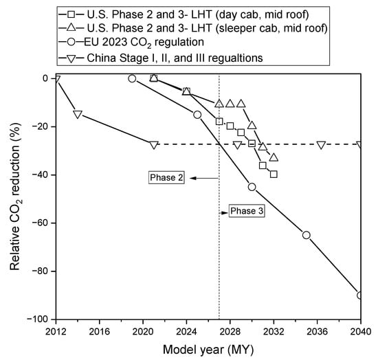 Regulatory push and cost savings from fuel consumption reduction are the main drivers for the technology upgrades in commercial vehicles. The emission regulations for LHTs are categorized as GHG and meet the criteria for pollutant emissions. Regulatory limits aiming to reduce GHG emissions in LHTs vary between jurisdictions. Requirements for the U.S., EU, and China are summarized in Figure 4. The U.S. Phase 2 and 3 regulations, when combined, require an almost 40% CO2 reduction in LHTs in 2032 compared to 2021 levels []. In February 2023, the European Union announced more ambitious fleet average targets for CO2 reduction in HDVs, with 45% in 2030, 65% in 2035, and 90% in 2040 compared to 2019 levels [,]. Finally, China is in phase 3 of the fuel consumption standard, which applies to all new 2021 heavy commercial vehicles with a 15% lower fuel consumption limit than the previous phase.