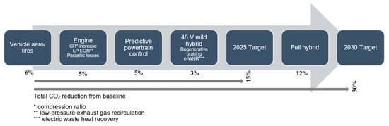 Commercial vehicles must meet stringent emission and CO2 regulations alongside FE improvements to lower operational costs. Fuel-saving technologies for HDVs can be generally classified as engine, powertrain, or vehicle efficiency improvements. There are significant interactions: downspeeding, for example, leads to lower friction losses and hence higher engine efficiency but is only achievable through a combination of engine design to improve torque at low rotational speeds, combined with advanced transmissions incorporating more reactive shift strategies and a reoptimized final-drive ratio. To meet emissions targets, incremental technology improvements across all aspects of the LHT will be required. A good example of combining different technology pathways is a study by Pischinger et al. [] to reach the European 2030 CO2 target defined in 2019 (note that this does not address the current, more aggressive restrictions from 2023). Different engine, driveline, and vehicle technologies are incorporated in the analysis as shown in Figure 6; hybridization is recognized as a potential contributor, along with vehicle, engine, and powertrain control improvements.