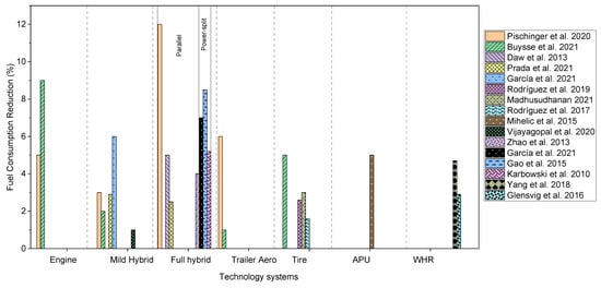 By reviewing the literature on LHTs, the general contribution of engine, powertrain, and vehicle technologies to FE improvement is comparable with the results of Pischinger et al. This alignment is shown in Figure 7, which illustrates an overview of the current FE improvements in LHTs. Figure 7 results are from research papers evaluating different technology features in LHTs in the U.S. and Europe; the papers relied on simulation to assess FE benefits and selected different baseline LHTs. The details of engine, vehicle, and powertrain technologies will be discussed in the next sections.