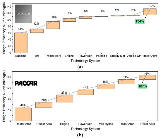 OEM’s claimed efficiency benefits from technology elements as a share in freight efficiency improvement in the SuperTruck II program relative to the 2009 baseline vehicle for (a) DAIMLER and (b) PACCAR [,].