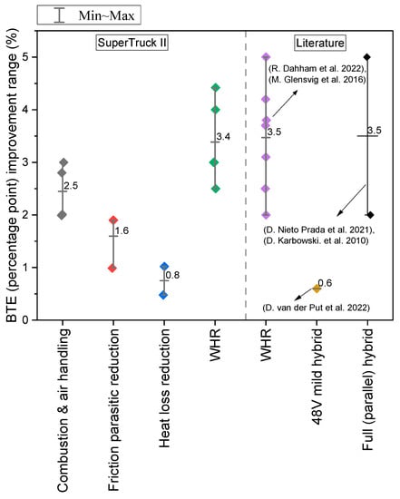 Range of brake thermal efficiency improvements for selected engines and powertrain system advances. Changes are absolute (percentage point) improvements in BTE over the various studies referenced. Results from the SuperTuck program based on OEM reports to sponsor DOE [,,,,,,] are separated from selected other studies [,,,,].