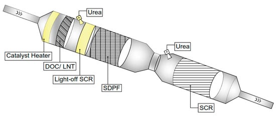 Potential aftertreatment architecture to comply with the Euro VII regulation adapted from []. LNT and SDPF stand for lean NOx trap and SCR-catalyzed diesel particulate filter (a DPF with SCR coating), respectively.