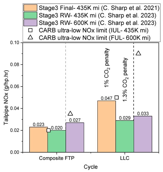 In a recent work by Sharp et al. [] from Southwest Research Institute (SwRI), the authors showed that they achieved CARB ultra-low NOx MY 2027+ limits by modifying the aftertreatment system over composite (cold and warm starts) Federal Test Procedure (FTP) and low load cycle (LLC). The authors compared the results with both CARB intermediate useful life (IUL) and full useful life (FUL) limits in each cycle. However, in some modes, there is an added CO2 penalty. The summarized results for stage 3 (previous work by the authors []) and stage 3 RW (rework) are shown in Figure 11.