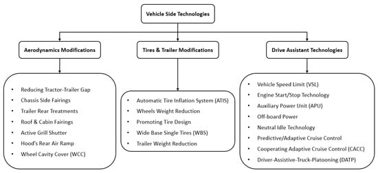 In addition to advancing engine-side technologies aimed at improving FE and reducing emissions in LHTs, various vehicle-side modifications can be implemented apart from engine-related changes. These vehicle-side technologies encompass a range of enhancements, including aerodynamic modifications, tire and trailer weight modifications, and drive assistant technologies, as shown in Figure 12. Vehicle side improvements are essential in enhancing tractor–trailer efficiency, which has been reflected in U.S. Phase 2 GHG regulation [,]. Although the CO2 emission of the trailer by itself is zero, its design greatly impacts the fuel consumption of LHTs. The most substantial resisting force for LHTs during highway driving at 0 grade is aerodynamic resistance. The aerodynamic resisting force is proportional to the second power of velocity, and it accounts for up to 25% of LHTs’ fuel consumption [,,]. However, the impact of aerodynamic drag forces can be minimized by enhancing aero features on both the tractor and trailer sides [,]. The critical areas in an LHT on which the aerodynamic drag affects are: (1) the front surface and roof of the tractor; (2) the tractor–trailer gap; (3) the rear end of the trailer; and (4) the side and under-body of the trailer.