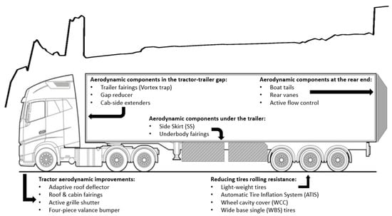 Representative schematic of a European cab-over tractor–trailer configuration for an LHT with indicative areas of aerodynamic drag and rolling resistance reductions. The trend line represents qualitatively the net contributions of each segment to the overall vehicle drag.