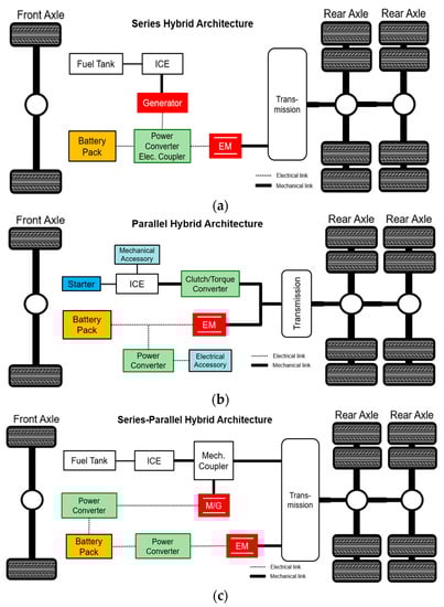Representative configurations of (a) Series hybrid (SH), (b) parallel hybrid (PH), and (c) power-split hybrid (PSH) long-haul truck (LHT). Note that within each class, there can be variations in location, type, and number of individual components.