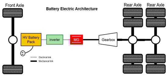 A medium voltage range (~48 V) is utilized in a mild-hybrid configuration, incorporating a small electric motor and battery. The motor/generator can be positioned as an integrated starter generator (ISG) at the front of the engine, replacing the conventional starter and alternator, or directly connected to the crankshaft between the engine and the clutch via a belt [,]. The small electric motor and battery serve several functions in a mild-hybrid configuration, including engine start/stop during idling, regenerative brake energy recovery, drivetrain torque enhancement, and powering electrical accessories []. Micro-hybrids, a subset of mild-hybrid configurations, encompass all the mild-hybrid functions, excluding powertrain torque enhancement due to lower operating voltage and electric motor power, making them less applicable for commercial trucks [].