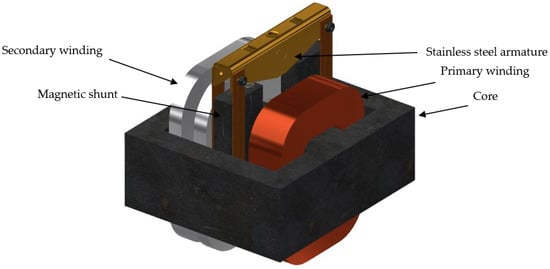 In the present work, the authors describe three-dimensional magnetic field modeling in an HLR transformer with radial leakage field dissipation (Figure 1) and beveled edges in its magnetic shunt. The movable shunt packages are fastened with an armature made of stainless steel structural elements (Figure 1). Due to this, within our field analysis, we considered the magnetic system of the shell-type core and only shunt packages without non-magnetic structural components as well as the two windings made of different materials. The primary winding is made from a copper profile wire of rectangular cross-section (1.6 mm × 5 mm) and the secondary one is a two-section made of aluminum strip of cross-section (2.5 mm × 17 mm).