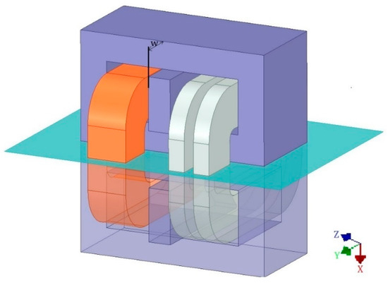 Symmetry and antisymmetry planes make it possible to reduce the computational area and thus reduce the number of discretization grid elements, which significantly reduces the size of the equations necessary to solve and the calculation time while maintaining the solution’s accuracy. Due to the movable magnetic shunt position and the object’s unsymmetrical winding execution, it is possible to include only one symmetry plane in the analysis, as in Figure 4. The conditions of symmetry and antisymmetry can be described by vector potential identities on both sides of these planes using Equations (3) and (4), respectively [25,26].
