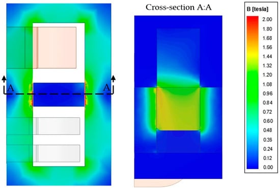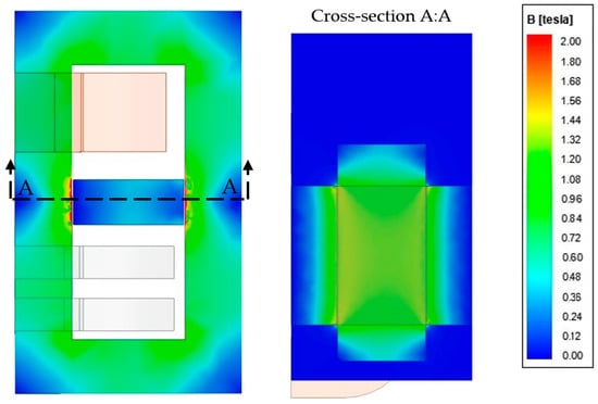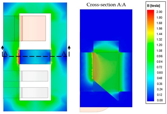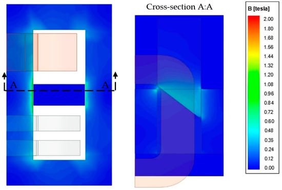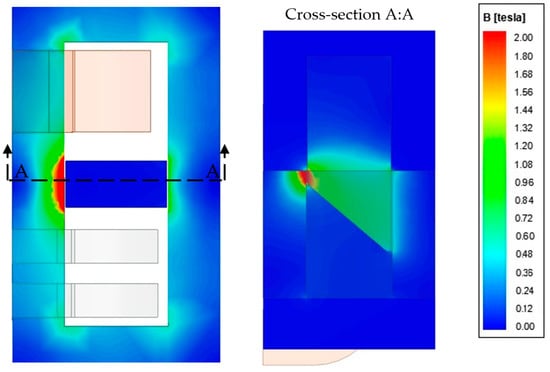 Pulling the magnetic shunt out causes a part inside the transformer window and the core edges slightly saturation. For the cuboidal shunt (α = 0°) only, its slight saturation is visible on both sides; see Figure 11. For the beveled shunt, at this value of its protrusion, the magnetic “hot spot” (saturation) occurs only in the place of the shunt’s shorter surface inserted into the transformer window (Figure 12). This has a direct impact on the local construction overheating, so the temperature field analysis could be undertaken in further research.