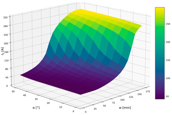 Based on the magnetic field distribution, the transformer leakage reactance was determined for each beveling and shunt position. Based on this, the current I2 related to the secondary winding was calculated, with the primary side powered with a voltage equal to 380 V. When the shunt is fully inserted into the transformer window, its beveling in the range of 0–20° does not affect transformer leakage reactance. Further angle α increasing shortens the active length of the shunt width located in the transformer window, which translates into a decrease in maximum leakage reactance value. This situation could be interpreted as an intermediate shunt position in the transformer window. On the opposite, for the extreme case when the magnetic shunt is fully extracted, the shunt beveling will have no significant effect on the leakage reactance, which is almost constant. Considering the above, at small bevel angles, the short-circuit reactance characteristic in the initial stage of shunt extraction is somewhat flattened. However, in the final phase of shunt extension, the reactance values change significantly. Beveling the shunt below 20 degrees does not affect the leakage reactance adjustment range. For bevel values above 20 degrees, the maximum leakage reactance value decreases, reducing the adjustment range while increasing the smoothness of the secondary winding short-circuit current regulation. The reactance changes impact strongly the short-circuit current intensity I2, which is visible in Figure 13.