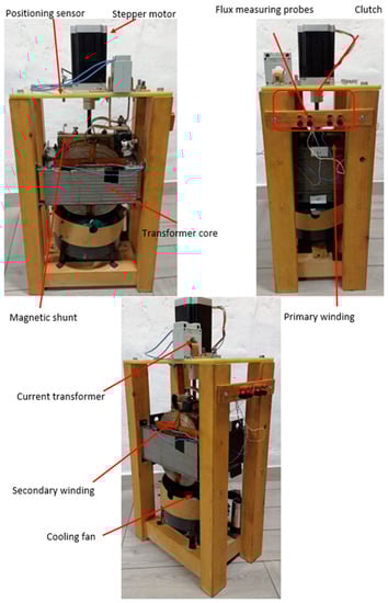 The proposed simulation model of the described transformer was verified by comparing the flux density distributions at the chosen leakage zone points and by comparing the most important integral parameter of the electromagnetic field—transformer leakage reactance. The first verification allows for a detailed assessment of the quality of the mathematical model and works very well in finding the so-called magnetic hot spots. However, a comprehensive local errors assessment would require measurements of all magnetic flux density vector components for the entire transformer leakage zone. Therefore, due to the multitude of variants of shunt positions, and current excitation, the comparison of the calculated and measured leakage reactance values was chosen as the main criteria for evaluating the model quality. Figure 14 shows the tested object with instruments that enable performing precise tests related to the magnetic shunt positioning in the transformer window.