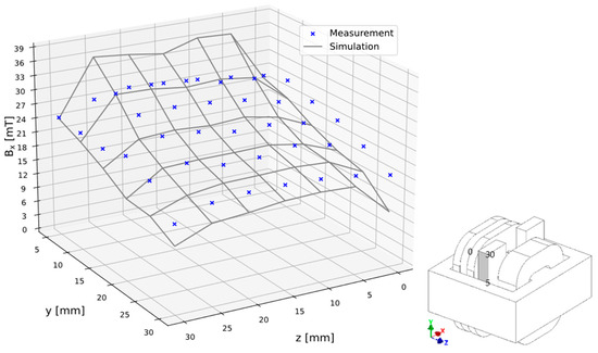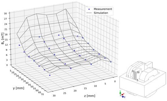 Comparison of the simulated and measured Bx values, of the flux density vector at the points for 4.5 mm from the shunt surface for w = 30 mm of the magnetic shunt extraction.