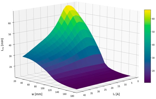 Knowledge of the distribution of magnetic potentials allows the calculation of their spatial derivatives in order to determine the components of the cartesian magnetic flux density vectors. However, the most relevant parameters are those calculated from the flux density vectors’ field integration. These are fluxes in the magnetic core and the leakage ones, stored energy, as well as windings inductances linked with the fluxes and magnetic forces. Assuming the flux density vector distribution in a surface , flux linkage with this surface can be determined via Equation (11).