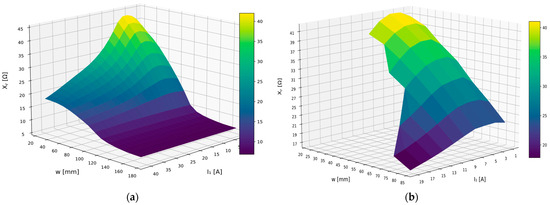The leakage reactance values comparison allows for a comprehensive evaluation of the field model. Figure 19a,b show the calculated and measured values of the windings’ leakage reactance transferred to the primary side.