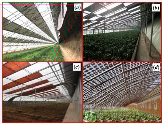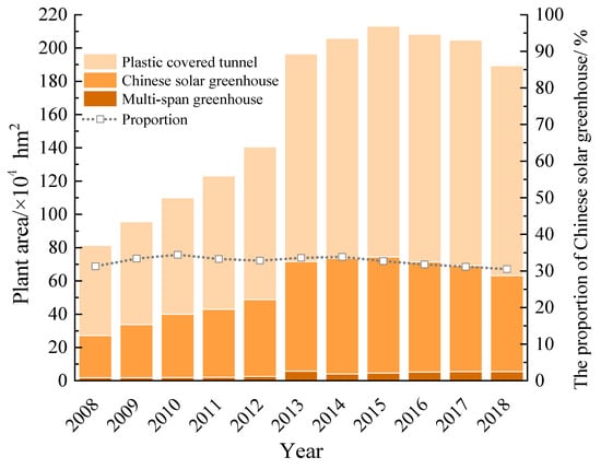 Facility horticulture in China started relatively late, due to strong and rigid demand for agricultural products (particularly vegetables) in the northern regions during the winter. The facility horticulture area in China has developed rapidly over the past 30 years, and the current facility horticulture area reaches 3.7 million hectares, which makes it the country with the largest facility horticulture area in the world []. In facility horticulture, the development of plastic greenhouses and Chinese solar greenhouses (CSGs) is the most rapid, while the multi-span greenhouse is slow (Figure 1). The light-transmitting covering material of the multi-span greenhouse comprises a film, glass, and a plastic plate. Research showed that the coal consumption of the multi-span greenhouse is about 90–150 kg/m2 in a year, and the coal cost accounts for 30–50% of the whole production cost []. Therefore, the multi-span greenhouse is difficult to develop on a large scale, even if the economy of the century develops to a certain level. The plastic-covered tunnel mostly uses bamboo and steel as a framework and is a simple arched greenhouse covered with plastic film. It is built when in use and dismantled when not in use. The little requirement for additional energy makes it mostly used in southern areas of China [].
