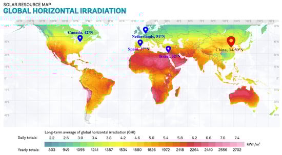 Chinese agriculture is changing from traditional agriculture to modern agriculture. Although plastic-covered tunnels and CSGs are still important production facilities [], high-yield and high-efficiency modern greenhouses are one of the directions of future Chinese agriculture development. With the continuous promotion of the modernization and industrialization of agriculture in China, the degree of dependence of agricultural production on energy has continuously increased. Compared with traditional agriculture, facility agriculture has a stronger dependence on energy. As shown in Figure 2, the climate and energy use patterns of agricultural facilities in China are very different from those in countries with advanced facility horticulture (http://solargis.com/maps-and-gis-data/download (accessed on 12 January 2023)). It is difficult to reduce energy consumption under complicated climate conditions in China without modifying Venlo-type multi-span greenhouses introduced from abroad.