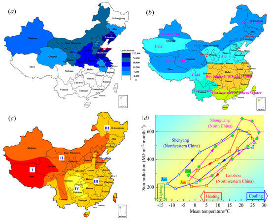 Distribution of solar greenhouse and various environmental resources in China: (a) solar greenhouse area distribution in Chinese provinces []; (b) climatic subdivision of the Chinese thermal engineering; (c) solar energy resource distribution in China, I (high areas), II (higher areas), III (general areas), and IV (low areas) []; (d) comparison of the average temperature of the three areas and the cumulative solar radiation per month in Shouguang (north), Lanzhou (northwest), and Shenyang (northeast) [,,].