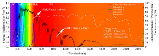 Solar energy distribution at the Earth’s sea level (solid black line) showing photovoltaic film transmissivity (dashed white line) and photosynthetic absorption spectra (solid color line) []. Different regional colors represent spectral colors of different bands.