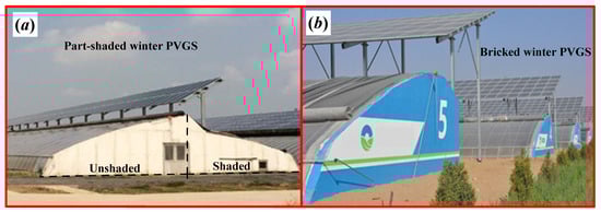 Photovoltaic cells arranged on the north wall of CSG: (a) part-shaded winter PVGs; (b) bricked winter PVGs.