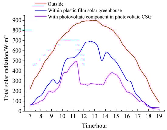 In terms of the effect of the amorphous silicon photovoltaic assembly coverage area on the CSG, Zhao et al. monitored the light environment and tomato growth conditions in a thin-film photovoltaic CSG and a plastic-film CSG (Figure 9) in Yanan city (36° N, 108° E). Under the layout with a ratio of 1:1 between the area of the film photovoltaic and the PC board, the total radiation transmittance within 2 h before and after noon on a clear day in the summer is 38.7%, and the photosynthetic effective light quantum flux density transmittance is 38.9%. They are, respectively, 30.3% and 17.6% lower than that of a plastic-film solar greenhouse. And during this period, the thin-film photovoltaic solar greenhouse can block 3949.8 kJ/m2 more heat into the room than the plastic thin-film solar greenhouse on a clear day []. Zhao et al. also experimented on the southern slope of a CSG in Yangling, Shaanxi (34°16′ N, 108°04′ E). Every three rows of film photovoltaic assemblies and PC sunlight plates are laid from west to east at intervals of 1:2 and 1:3. It is found that the total solar radiation with the 1:3 ratio in winter is increased by 50.3 W/m2, and the average transmittance of the total solar radiation is increased by 9.1%, but the transmittance of the average photosynthetic active quantum flux density is almost unchanged. The average light transmittance of the inclined plane formed by the amorphous silicon cell assembly and the PC board is changed within a range of 34.7~41.7% (Figure 10c) [].