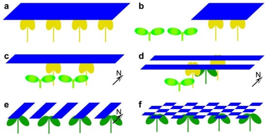 Some examples of possible opaque PV module arrangements above greenhouse crops: (a) 100% coverage; (b) concentrated partial coverage; (c) east–west straight; (d) stripe along east–west; (e) stripe along north–south; (f) checkerboard. Non-shaded, intermediately shaded, and heavily shaded plants are presented, respectively, as bright green, dark green, and yellow plants.