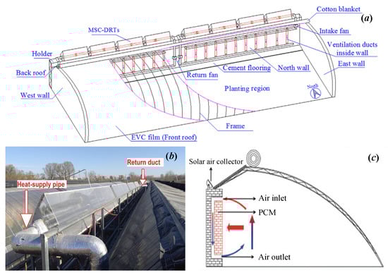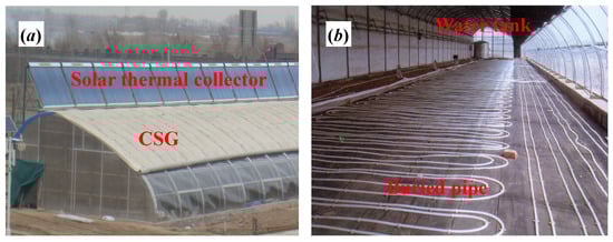 Application of solar heat collection in CSGs: (a) solar heat collectors arranged on the north wall of the greenhouse along the ridge direction of the greenhouse; (b) heat dissipation pipes and heat storage water tanks arranged in the greenhouse.