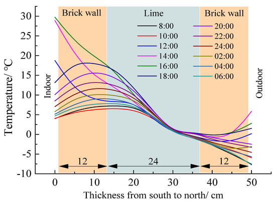 Time course of temperature at different depths of the north wall (Lime wall as an example), Note: Data in the plot were averaged for 20–21 December 2006.