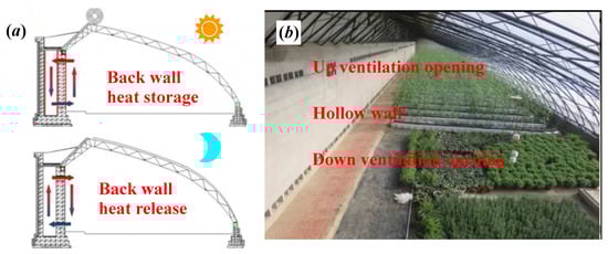 To accumulate more surplus heat energy in the daytime for heating at night without consuming energy sources such as electric power, Zhao et al. adopt the structure of a hollow wall body (Figure 14). The natural force is formed by utilizing the temperature differences and gravity differences of the air in the greenhouse and the wall body to introduce the greenhouse air into the hollow part of the wall body. The surplus heat energy from the Sun is stored in the deep part of the wall body, so that the large-area contact heat exchange between the air and the wall body is utilized. The heat accumulation and release effects are comprehensively exerted through the inner wall body material, the outer wall body material, and even the roof material at the top part. The purposes of storing solar heat energy more effectively, increasing the heat release capacity at night, and increasing the temperature at night have been achieved []. The upper and lower parts of the inner side of the hollow part of the wall body are uniformly provided with a plurality of vent holes along the horizontal direction. The vent holes communicate with the interior of the wall body and the indoor space. In this way, a new path is provided by forming air circulation flow around the inner side wall body. The height difference between the upper vent hole and lower vent hole is set at 2 m to ensure sufficient natural thermal pressure difference for air flow.