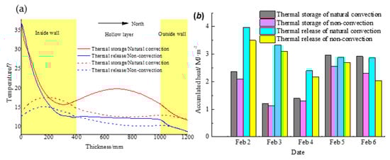 In Figure 15a, in the process of heat storage in the wall body by natural convection circulation of air, the temperatures of the indoor surface and the two wall surfaces of the hollow layer are higher in the daytime. Meanwhile, the air temperature of the hollow layer is higher than that of the two wall surfaces. This shows that the area of the wall body participating in heat exchange is not only the indoor surface but also the wall surfaces on both sides of the hollow layer. That is why the heat exchange area of the wall body has increased. The temperature of the convection air is lower than that of the north and south wall surfaces of the hollow layer at night. This indicates that the convection air is heated in the circulation process at night. On 2–4 February 2017, it was cloudy, and on 5–6 February, it was sunny. In Figure 15b, under the action of natural convection of air, the heat storage amount and the heat release amount of the hollow layer in the heat storage wall body account for 31% and 35% of the total heat storage and release amount of the greenhouse, respectively. Compared with the control wall body, the wall body structure has the advantages that the daytime heat storage capacity is improved by 15.1%, and the nighttime heat release capacity is improved by 14.7%. These advantages show that the wall body structure can improve the heat storage and release capacity of the wall body [].