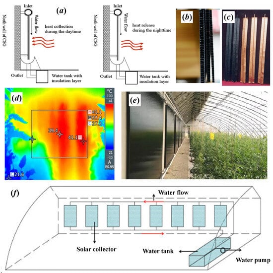 Solar energy is a renewable, clean energy source, and it is also a major source of light and heat for plant growth in CSGs. The solar heat collector is applied to the greenhouse active heating technology, so the requirement for fossil energy can be reduced. Moreover, the requirements for energy conservation and emission reduction are satisfied in an environmentally friendly way. The application principle of the active heating technology in CSG is that the solar heat collectors in different forms are used for storing solar radiation energy in the daytime, such as a heat-preserving water tank, a wall body, and soil. The stored heat is released into the greenhouse to increase the indoor temperature at night or in low-temperature weather, such as rainy days. When studying the heating effect of the solar heat collector in greenhouses, Chinese scholars mostly adopt the mode of installing the solar hot water collector outdoors to collect more solar heat (Figure 12a).