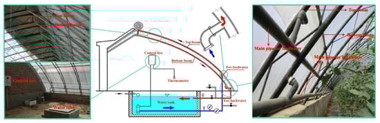 There are many methods to increase the ground temperature of greenhouses, such as heating with electric heating wires, biological reactors, underground heat exchange, and hot water. The heating of the soil with electric heating wires is the most direct and effective method, but the method has a large power consumption, so the method is essentially not adopted in large-scale vegetable production except for the use of greenhouse seedling culture or local heating in the greenhouse []. The biological reactor technology is a soil temperature-increasing form that has been widely popularized and applied in CSGs in recent years. It can improve the CO2 concentration in the greenhouse besides the ground temperature. However, the time difference in contradiction with the requirements of the greenhouse in the early and later periods of planting is larger []. Underground heat exchange technology has been transferred from Japan to China since the 1980s. It is mainly suitable for areas with better sunlight and stronger soil heat storage capacity []. The solar energy underground heat exchange device fully utilizes solar energy, and the relatively surplus energy in the daytime is transported to the underground through fans to heat the soil in the greenhouse and store the energy. When the temperature is low at night, fans are used to carry the heat stored in the soil to the air, so that the temperature in the facility is increased. Low-temperature hot water (the water temperature is mostly below 50 °C) is easy to obtain, simple to control, and uniform in soil and indoor temperature distribution. So, it is one of the most common methods for soil heating. The solar panel collector is used for collecting solar radiant heat. Water is used as a heating medium and directly supplied to the ground or soil of the greenhouse in an environmentally friendly way.