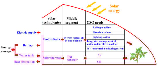 In China today, the capacity of solar water heaters and photovoltaic cells ranks first in the world. In recent years, the solar cell industry has faced the problem of excess capacity under the anti-dumping complaints of Europe and America on Chinese photovoltaic export products. The solar cell industry in China develops diversified consumption markets for destocking by combining related industries. The application demonstration of distributed photovoltaic power generation and the photovoltaic poverty relief policy promoted by the National Energy Bureau make the solar energy and agriculture industries complement each other []. After combining photovoltaic cells with CSG, the power generated by the solar energy system can be used for the functions of intelligent temperature control, irrigation, and light supplementation. Moreover, the residual electric quantity can be sold back to a power grid company to create additional benefits []. In addition, the photovoltaic CSG can effectively utilize land resources and avoid the problem of farmland occupation. In the critical period of vigorously promoting the development of modern agriculture in China, the development of the photothermal/photovoltaic CSG not only facilitates agricultural production, but also improves the agricultural technology level to a great extent.